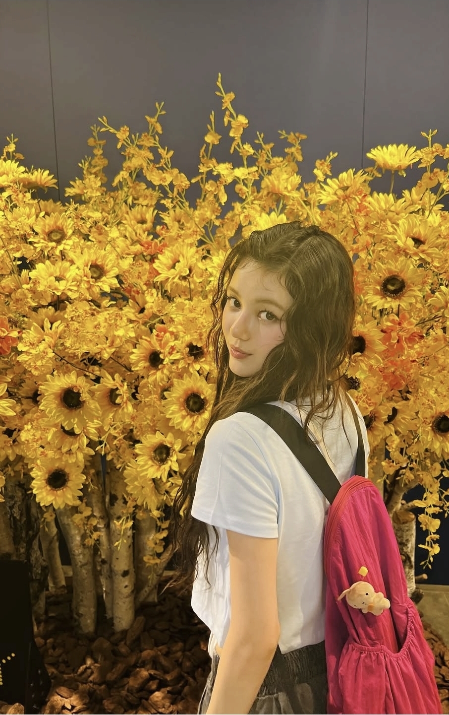 특히 오늘 제가 가져온 사진 속 다니엘 님의 모습은 정말 인상적이에요. 샛노란 해바라기 앞에서 카메라를 바라보는 다니엘 님은 마치 영화 속 한 장면 같지 않나요? 배경의 따뜻하고 강렬한 색감과 대비되는 그녀의 맑은 이미지, 그리고 센스 넘치는 캐주얼 룩이 완벽한 조화를 이루고 있어요.