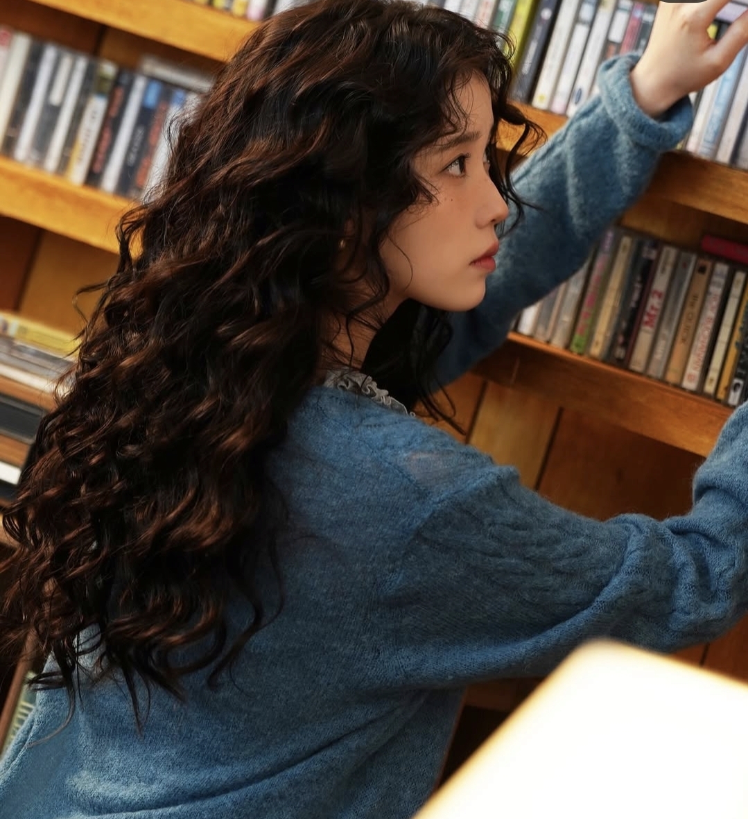 가장 먼저 제 눈길을 사로잡은 건 바로 빈티지한 감성이 물씬 풍기는 파란 니트를 입은 모습이었어요. 사진 속 아이유 님은 굵은 웨이브가 들어간 긴 머리를 늘어뜨리고 책장에 꽂힌 책이나 앨범을 고르는 듯한 포즈를 취하고 있는데요. 이 헤어스타일이 일명 히피펌이라고 하죠. 자칫하면 부스스해 보일 수 있는 스타일인데 아이유 님이 하니까 왜 이렇게 분위기 있어 보이는 걸까요. 차분한 딥 블루 컬러의 니트가 아이유 님의 하얀 피부를 더 돋보이게 해주는 것 같아요.