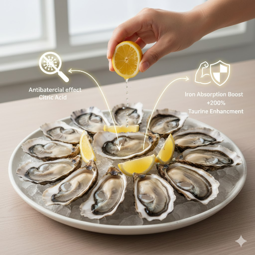 - 최고의 궁합 '레몬': 레몬의 강력한 '구연산(시트르산)' 성분은, 굴에 있을지 모르는 식중독균을 1차적으로 살균해 주는 효과가 있습니다. 또한, 레몬의 비타민C는 굴에 풍부한 '철분'과 '타우린'의 체내 흡수율을 200% 끌어올려, 굴의 효능을 극대화하는 '최고의 파트너'입니다.