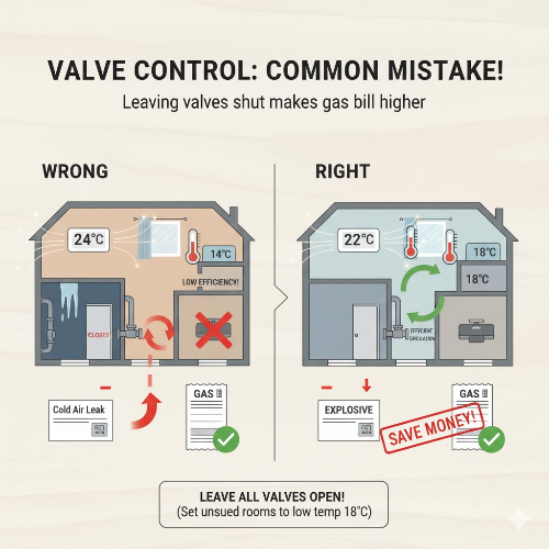 또한, 밸브를 잠가 냉골이 된 방의 차가운 기운이, 벽을 타고 거실과 안방의 온도를 계속해서 빼앗아가게 됩니다. 가장 좋은 방법은, 모든 방의 밸브를 열어두되, 안 쓰는 방은 18~20도 정도의 낮은 온도로 설정해, 집안 전체에 '냉기'가 흐르지 않도록 유지해 주는 것입니다.
