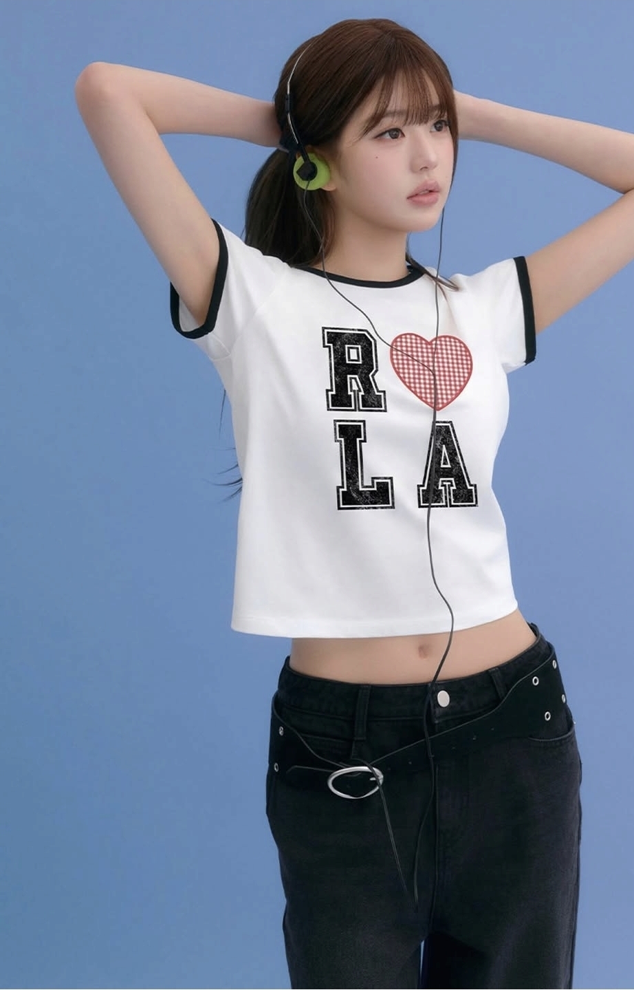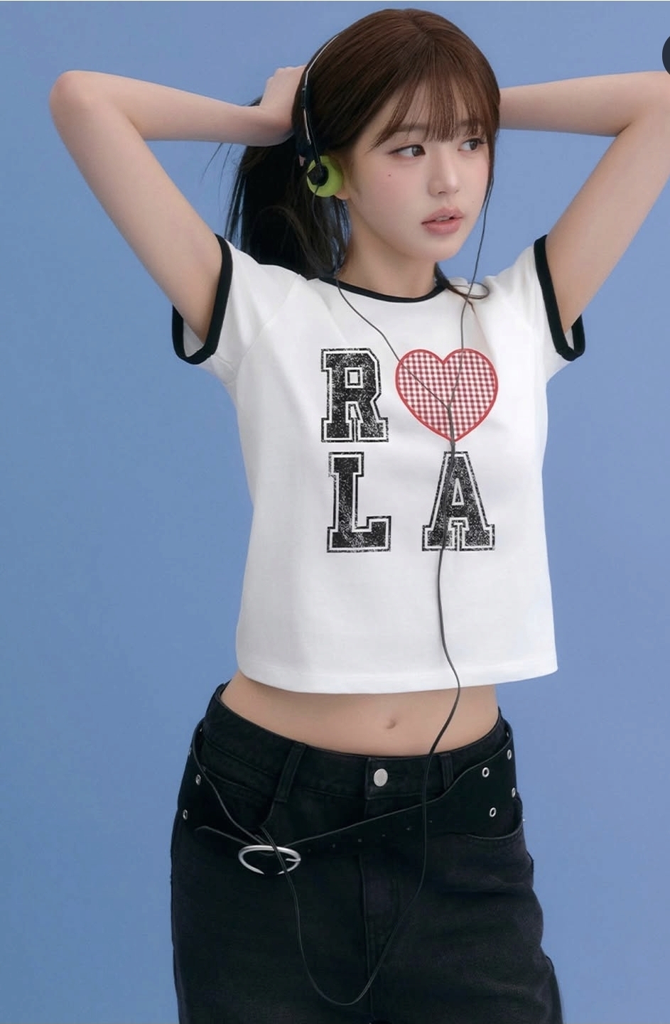 화이트 티셔츠에 블랙 팬츠, 그리고 헤드셋 하나.