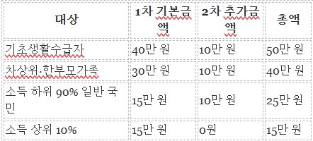 표를 보시면, 기초생활수급자는 최대 50만 원, 차상위는 40만 원, 일반 국민 중 소득 하위 90%는 25만 원, 상위 10%는 15만 원을 받게 됩니다. 가구가 아니라 개인 단위로 지급해 형평성을 높인 점도 특징이에요.