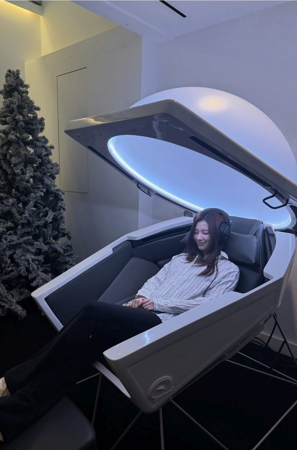 사진 속에서 특히 눈에 띄는 장면은 캡슐 형태의 휴식 장비 안에서 편안하게 쉬고 있는 모습입니다. 헤드폰을 착용한 채 눈을 감고 있는 장면은 단순한 사진을 넘어서, ‘관리하는 일상’을 보여주는 느낌입니다.