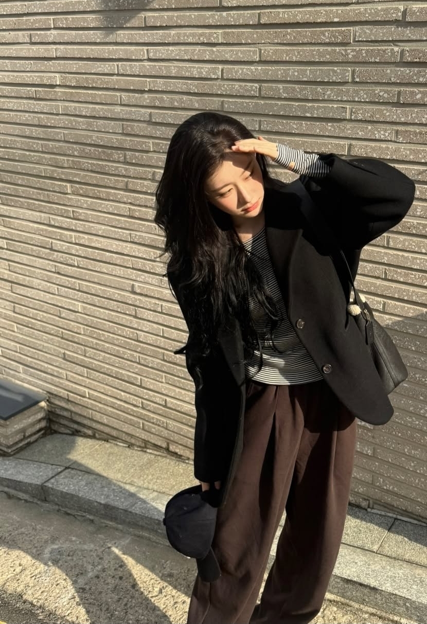 가장 먼저 눈에 띄는 아이템은 바로 블랙 컬러의 아우터입니다. 어깨 라인이 살짝 드롭되거나 여유로운 오버핏의 재킷(또는 울 코트)을 선택하셨어요.